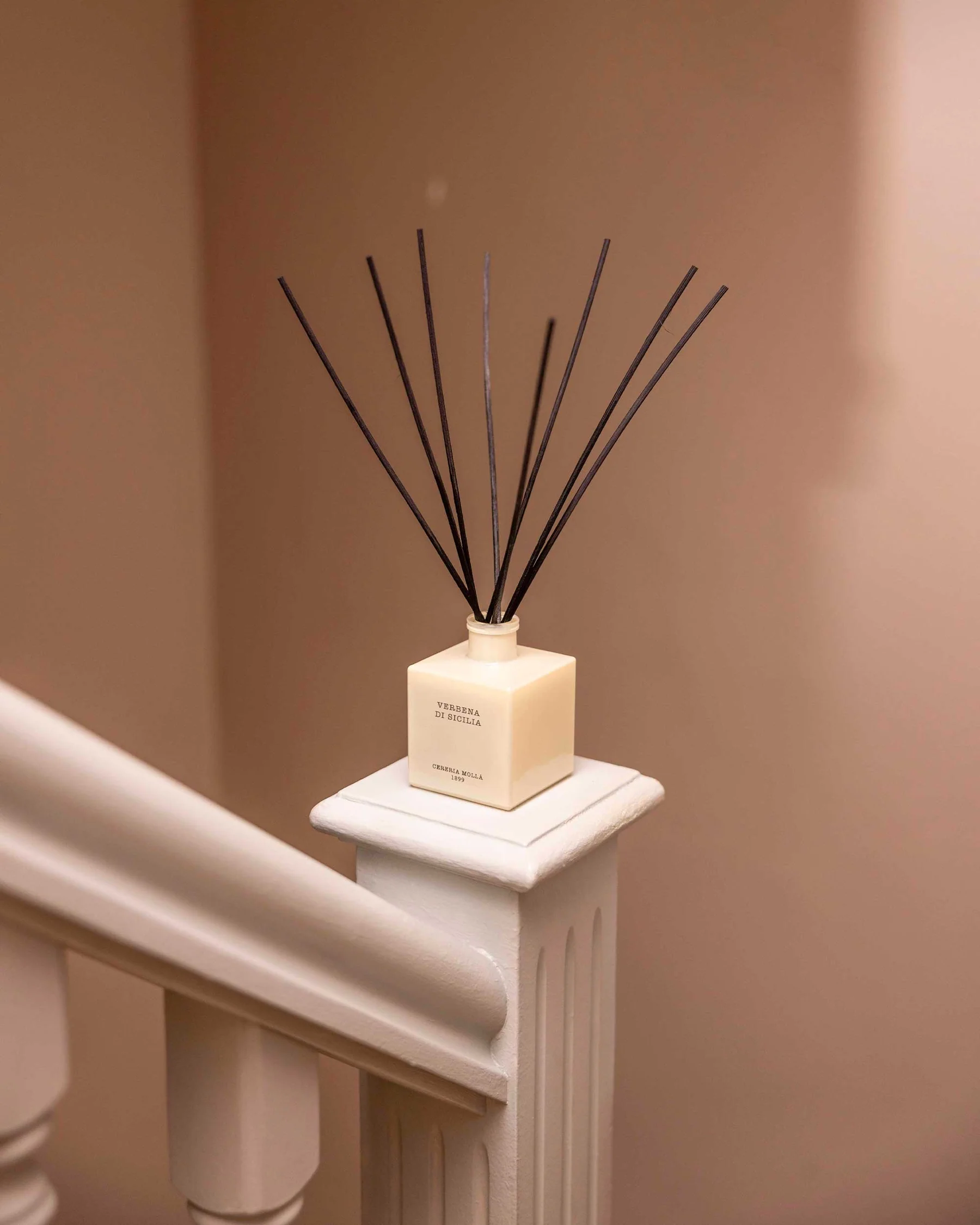 Il diffusore premium Verbena di Sicilia è contenuto in un elegante flacone in vetro color crema, pensato per integrarsi facilmente in ambienti arredati in stile naturale, contemporaneo o minimal. Inoltre, il prodotto include 12 bastoncini in rattan nero da 25 cm, progettati per garantire una diffusione ottimale e uniforme della fragranza.