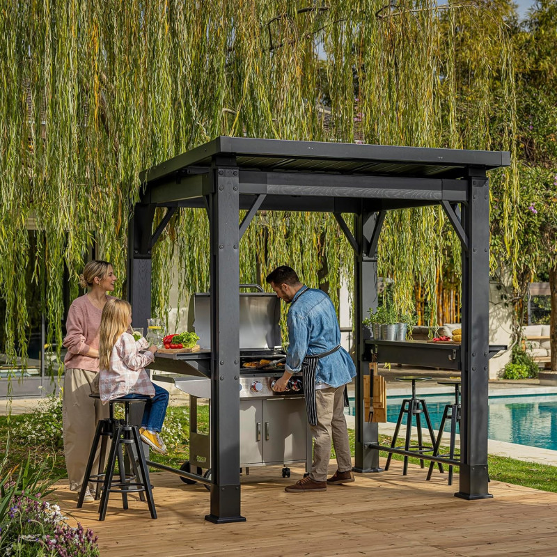 Il risultato è un gazebo per barbecue resistente alle intemperie, progettato per durare nel tempo mantenendo un’estetica raffinata color noce (Walnut).