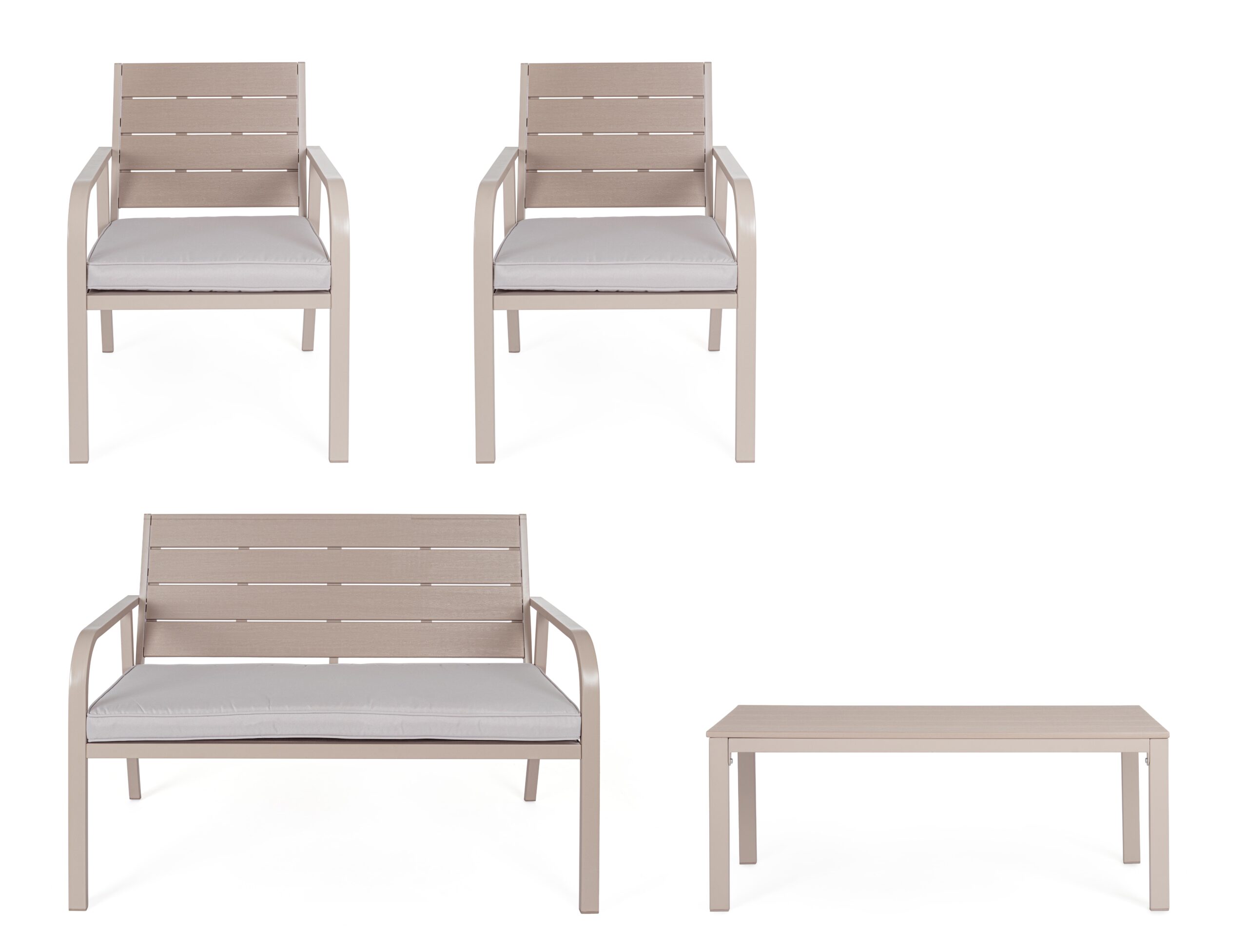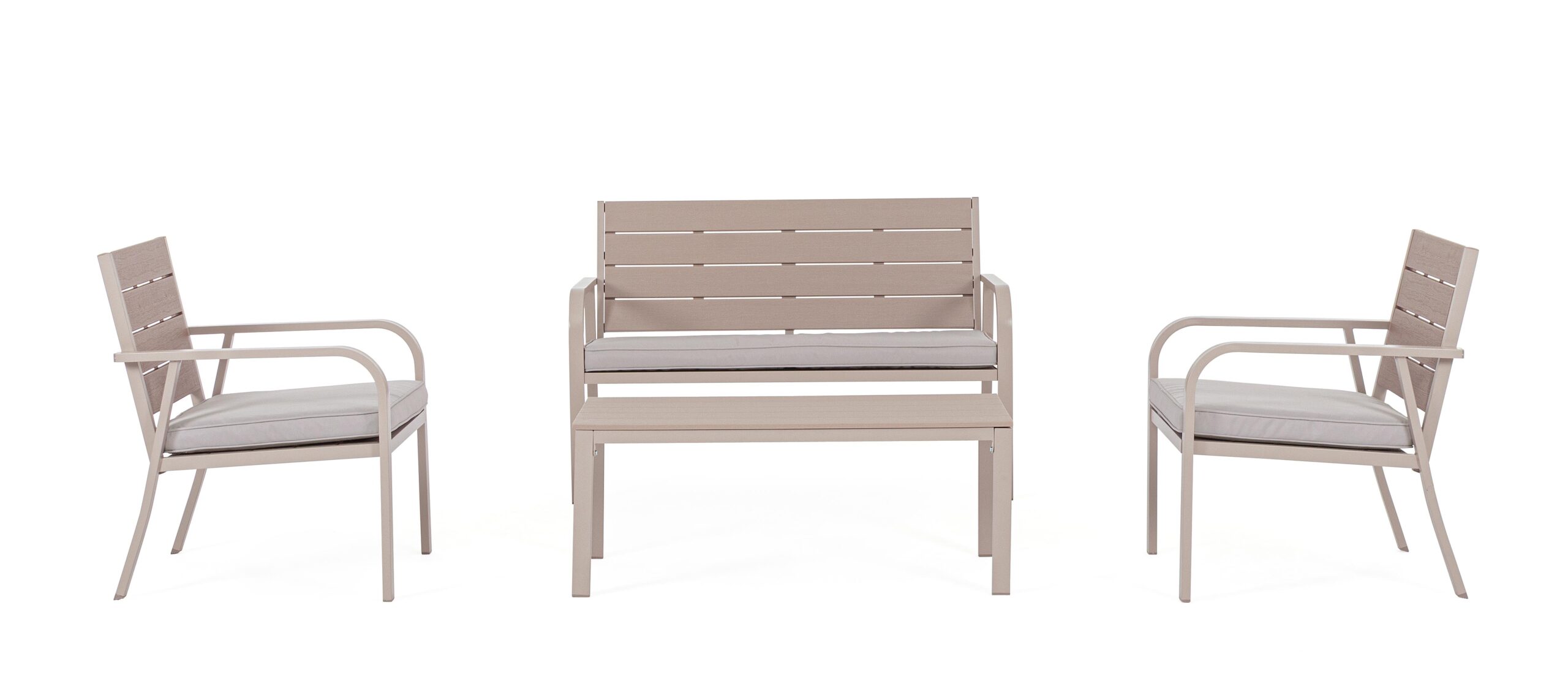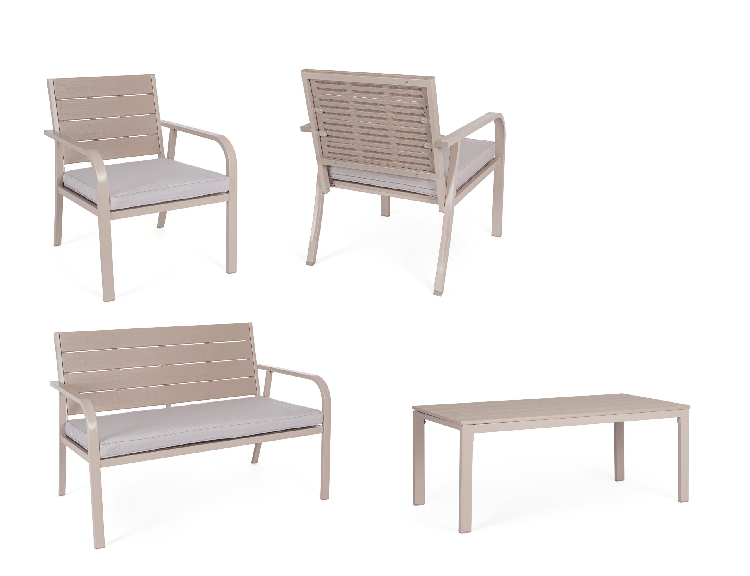 La struttura è realizzata in acciaio trattato per esterno tramite fosfatazione e verniciato a polvere (poliestere), garantendo resistenza alla ruggine e agli agenti atmosferici. Sedute, schienali e piano tavolino sono in HDPE (polietilene ad alta densità) effetto legno venato, offrendo un aspetto naturale e raffinato senza la manutenzione del legno vero. I cuscini sfoderabili in tessuto poliestere idrorepellente assicurano comfort e facilità di pulizia.