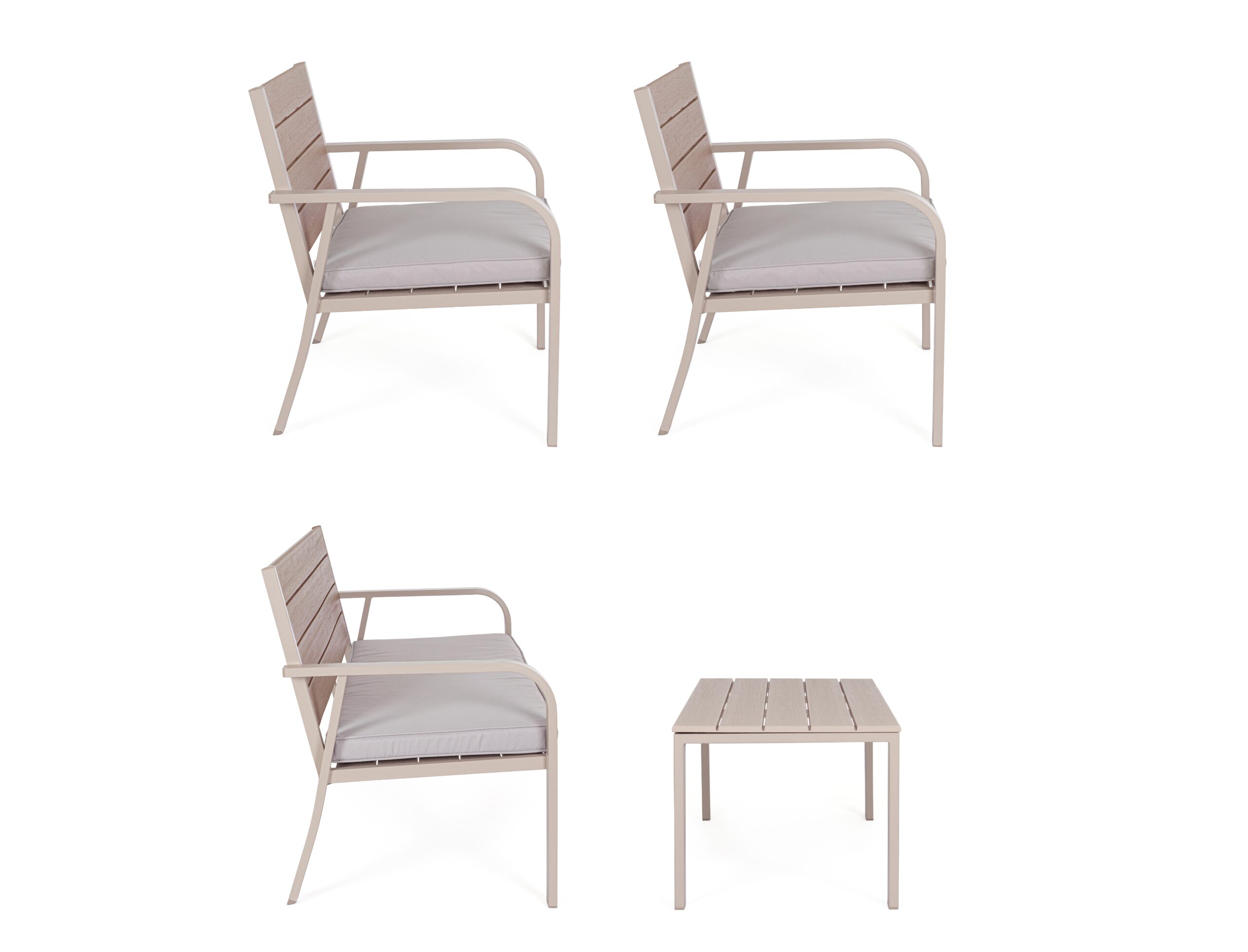 Set Salotto Con Cuscini Sarita Tortora in Acciaio e HDPE Effetto Legno