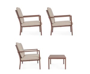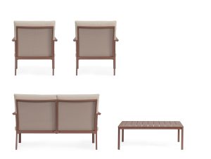 Il set è realizzato in alluminio verniciato a polvere (poliestere), che garantisce leggerezza e resistenza agli agenti atmosferici. La finitura Barn dona un aspetto elegante e contemporaneo, proteggendo la struttura da graffi e corrosione. Inoltre, la viteria in acciaio inossidabile assicura un montaggio solido e duraturo, essenziale per un arredo esterno di alta qualità. Le sedute e lo schienale in textilene 1x1 offrono comfort e traspirabilità, mentre i cuscini sfoderabili in tessuto idrorepellente Olefin aggiungono praticità e resistenza.